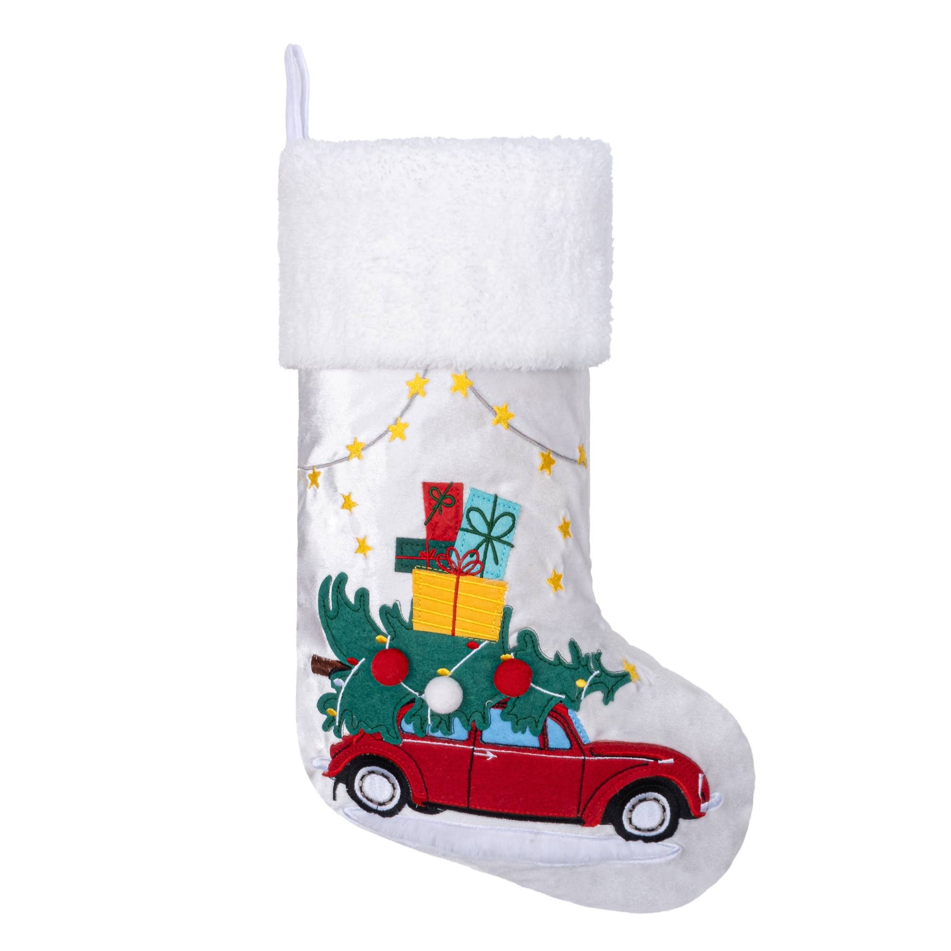 Elevate your holiday decor with this Christmas stocking, crafted from luxurious velvet. Adorned with festive designs of a car pulling a Christmas tree, this stocking bursts with holiday cheer. Perfect for hanging on your fireplace, Christmas tree, or wall, it adds a touch of Christmas magic to any setting.