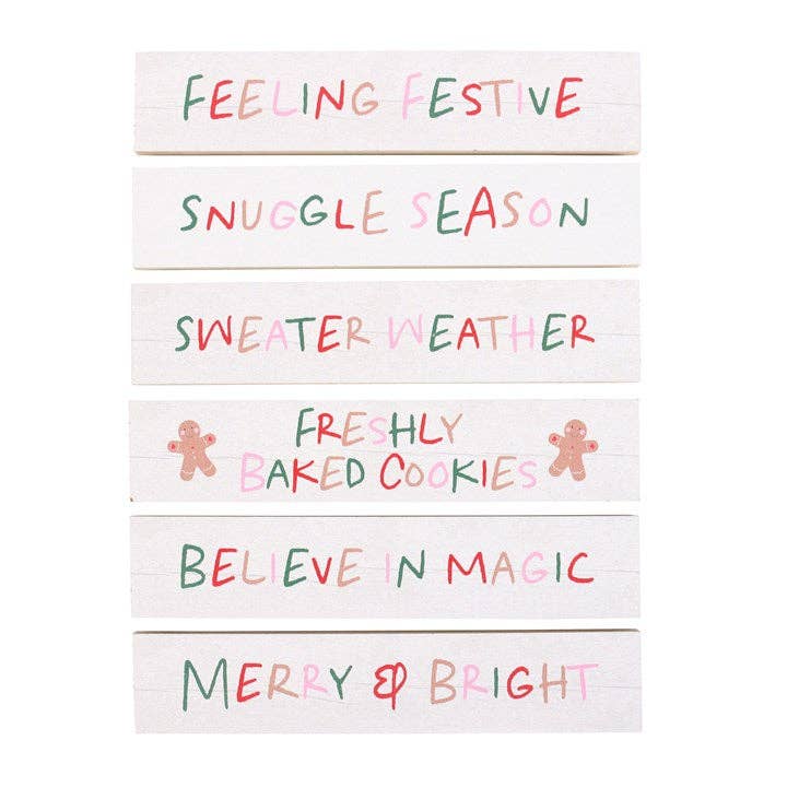 6 different cozy designs perfect for welcoming the Christmas season. Phrases include: 'Feeling Festive', 'Snuggle Season', 'Sweater Weather', 'Freshly Baked Cookies', 'Believe in Magic', and 'Merry & Bright'.